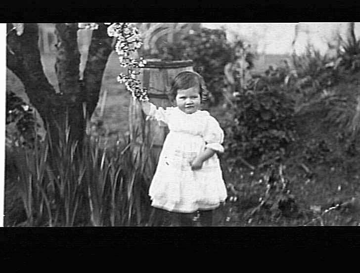 Portrait of a young child in a garden. She appears to be pulling on a branch of flowers from a tree.