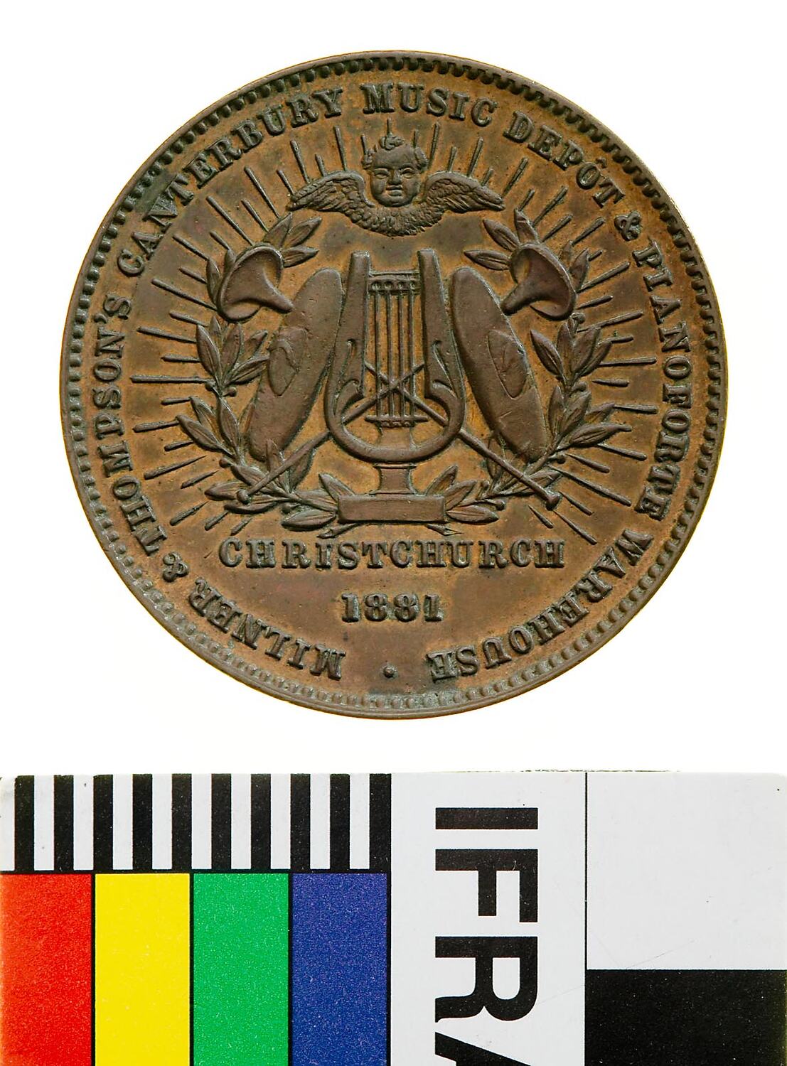 Obverse: MILNER & THOMPSON CANTERBURY MUSIC DEPOT & PIANOFORTE WAREHOUSE CHRISTCHURCH 1881 Reverse: NEW ZEALAND