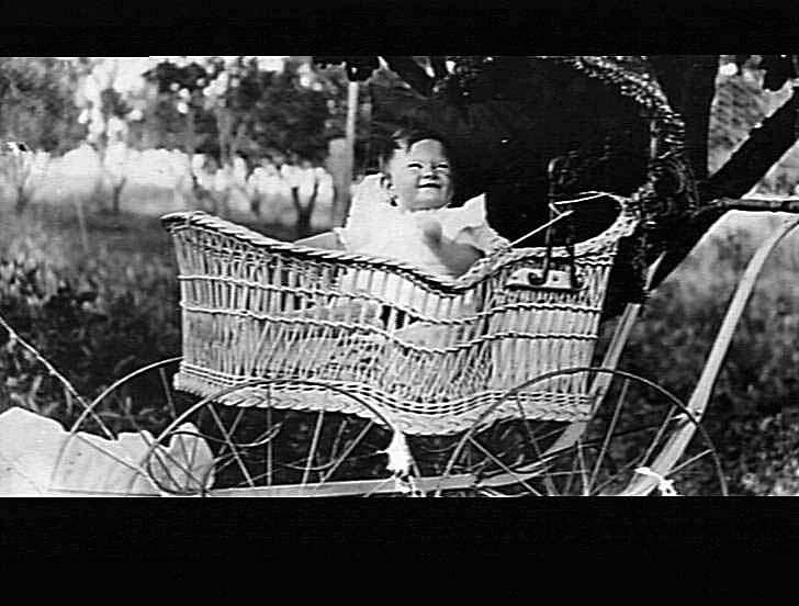 Yloung girl sitting looking out of a cane perambulator.
