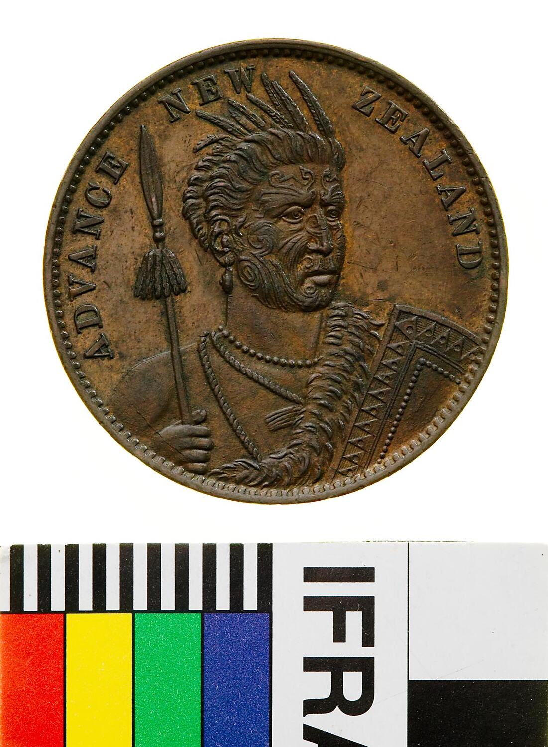 A round copper token (34 mm diameter). The token features a Maori warrior standing on an island in front of a palm tree. He holds a large square shield on the ground with his right hand and a weapon in his left. The shield is quartered with plants in each sector, a kiwi emerges walking left from behind the shield. In the sea behind the prow of a war canoe can be seen to the left of the kiwi and a mountainous island is seen in the background. Around, NEW ZEALAND The reverse features a bust a Maori warrior facing three-quarters right with tattooed face, wearing a feather headdress and holding a spear in his right hand and shield.