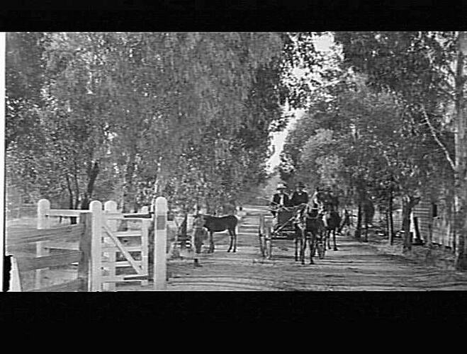 View down roadway past a house. Two people are travelling in a four wheeled horse-drawn cart, another rides a horse. A boy stands next to a loose horse.