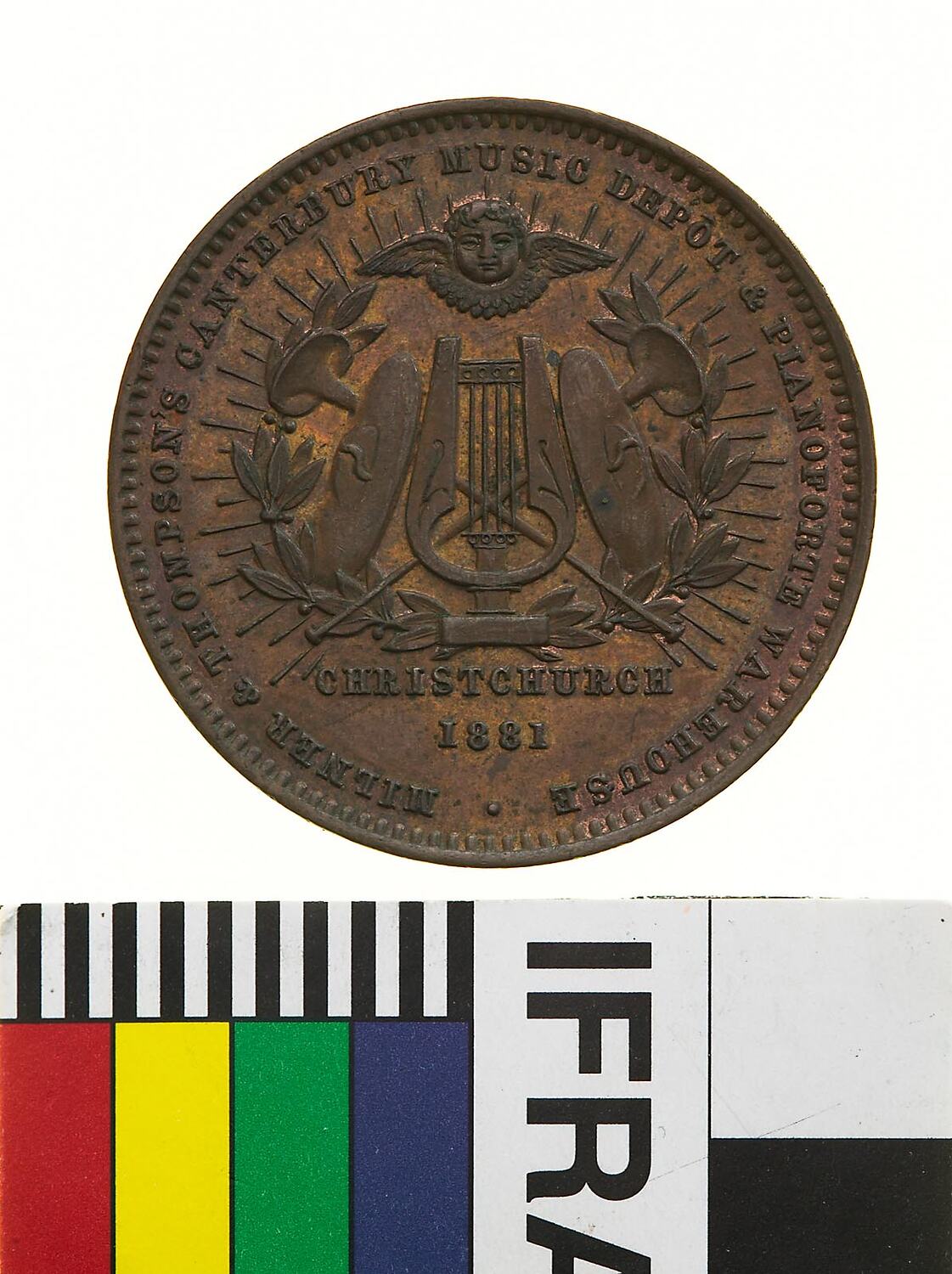 Obverse: MILNER & THOMPSON CANTERBURY MUSIC DEPOT & PIANOFORTE WAREHOUSE CHRISTCHURCH 1881 Reverse: NEW ZEALAND