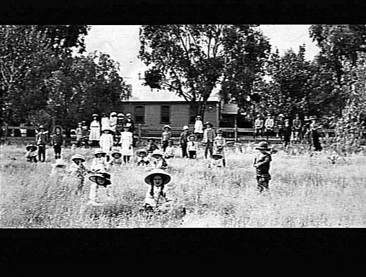 Group of children dispersed through a field adjoining the school building. Some of the children are wearing large sun hats.