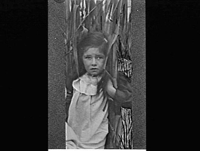 Portrait of young girl standing against tall reeds.