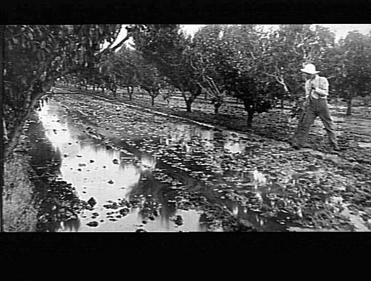 'Orchard irrigation': Harold Pitts in the orchard. Shows flood irrigation method of watering fruit trees.