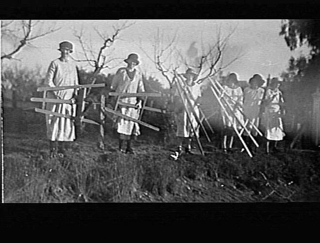 Group portrait of six women, wearing painters' smocks and caps, carrying easels.