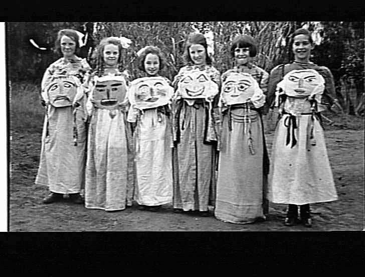 A line of six children dressed 'back to front' as woman rag dolls. They hold masks with faces on the back of their heads and aprons.