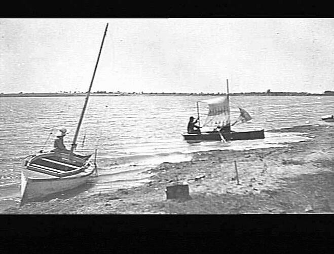 'Lake Boga'. Two small sail boats, with people on board, beached on the shore of the lake.