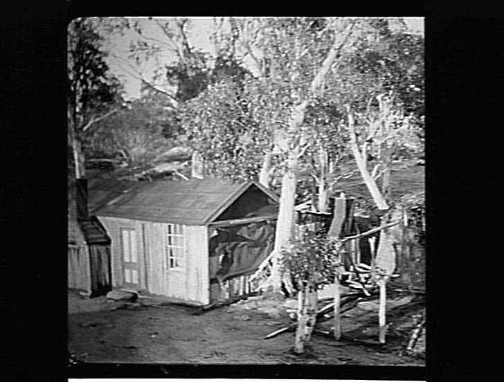 Landscape view taken at Mount Buffalo and environs in the Victorian Highlands. Shows view of a small workers hut which is either being extended of has partially collapsed.