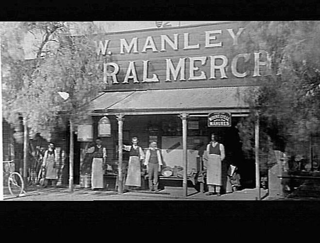 'Merrigum Store'. Small group of shop keepers standing outside. W. Manley, Rural Merchants.