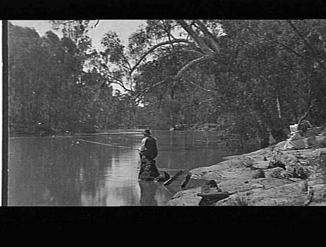 A man stands in the Goulbourn River fishing. A woman watches from the bank.