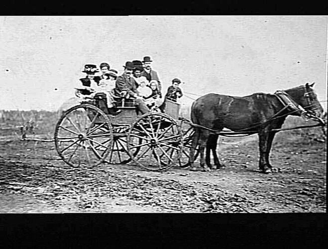 Group portrait of two families sitting in a horse drawn four wheeled buggy shows horse.