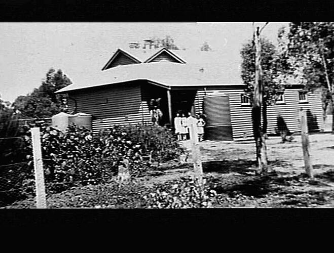 Exterior view of the Merrigum school students stand in the entrance doorway.