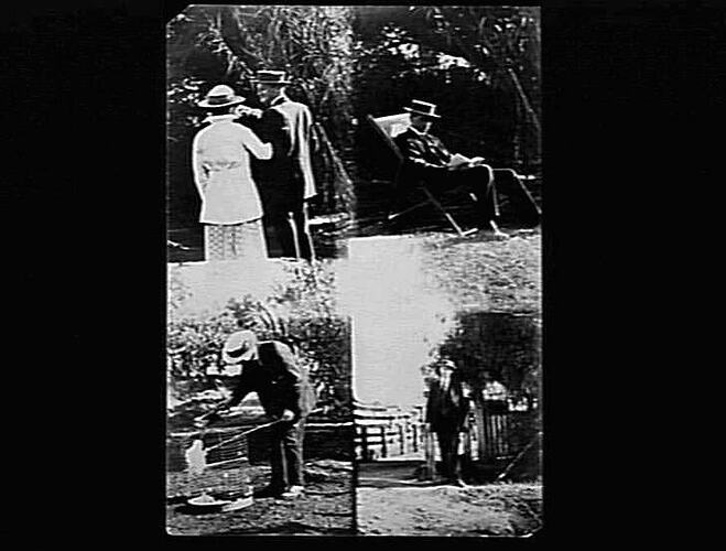Four portraits of a man: walking arm in arm with a woman; sitting in a deck chair; prodding a cockatoo in a cage with a stick; standing near a fence.
