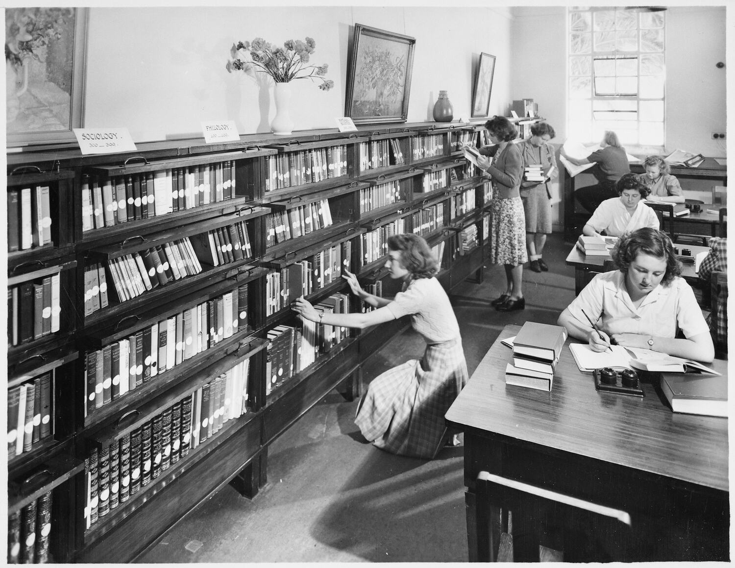 Negative photograph of students in a library at the Emily Mcpherson College, Melbourne, circa 1947. At the rear of the image, a woman reading a newspaper at a desk may be the same person depicted in MM 068099, taken in October 1947.