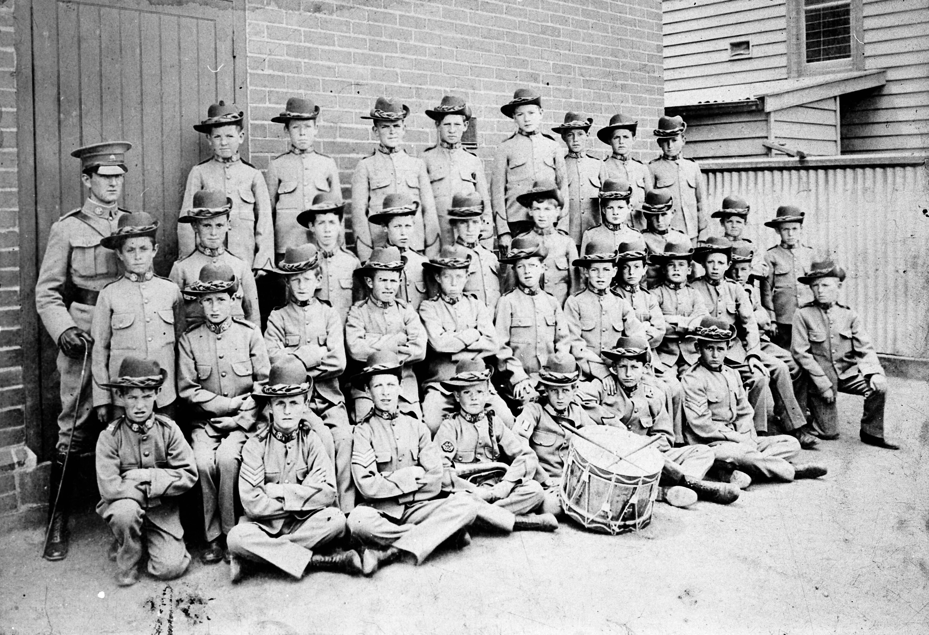 A group of school cadets outside St Augustine's Church Hall, Yarraville, circa 1906. They would have been Junior Cadets within the Victorian Volunteer Cadet Corps.