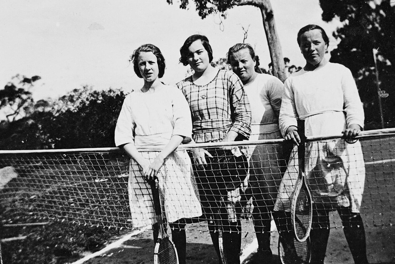 Black and white negative of four girls standing at a tennis net, Ashens, Victoria, 1927.