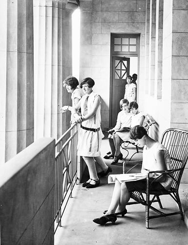 Students on the balcony of the Emily Mcpherson College, circa 1927-1935.