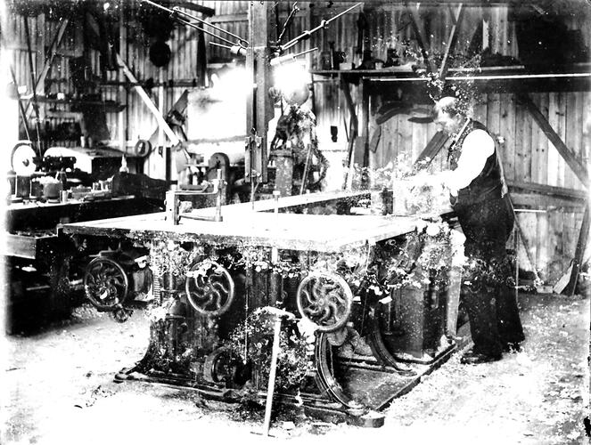 Man inside a workshop. Damage to the photograph obscures his action but he appears to be guiding a piece of wood through a saw.
