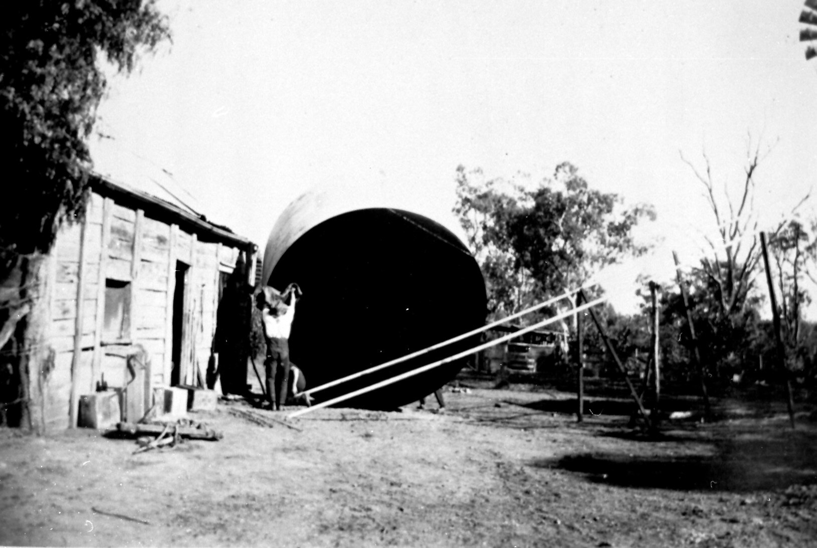 Men putting a water tank on a tank stand on Waugorah station. Poles have been run from the ground to the top of the stand and the tank is being manoeuvred onto the bottom of the pole ramp. (One of a series of images, see also MM 006251-006253).