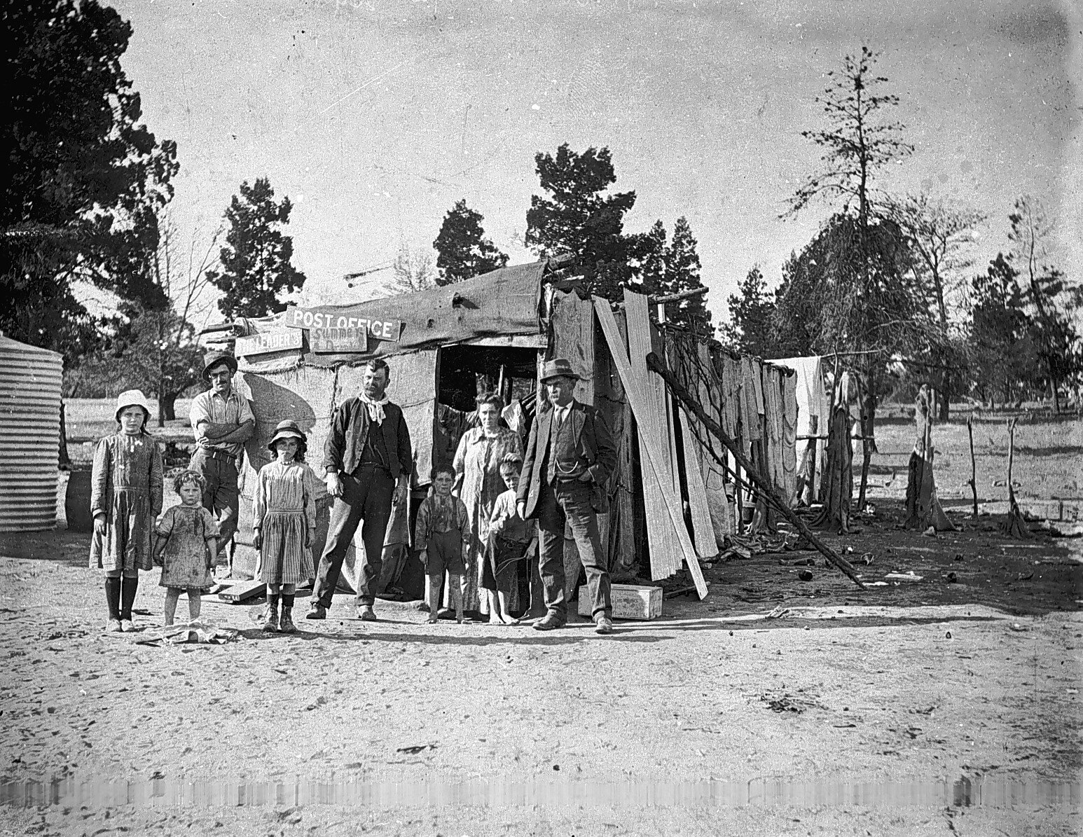 A group outside a hut constructed of hessian and corrugated iron. The hut carries a sign identifying it as a Post Office.