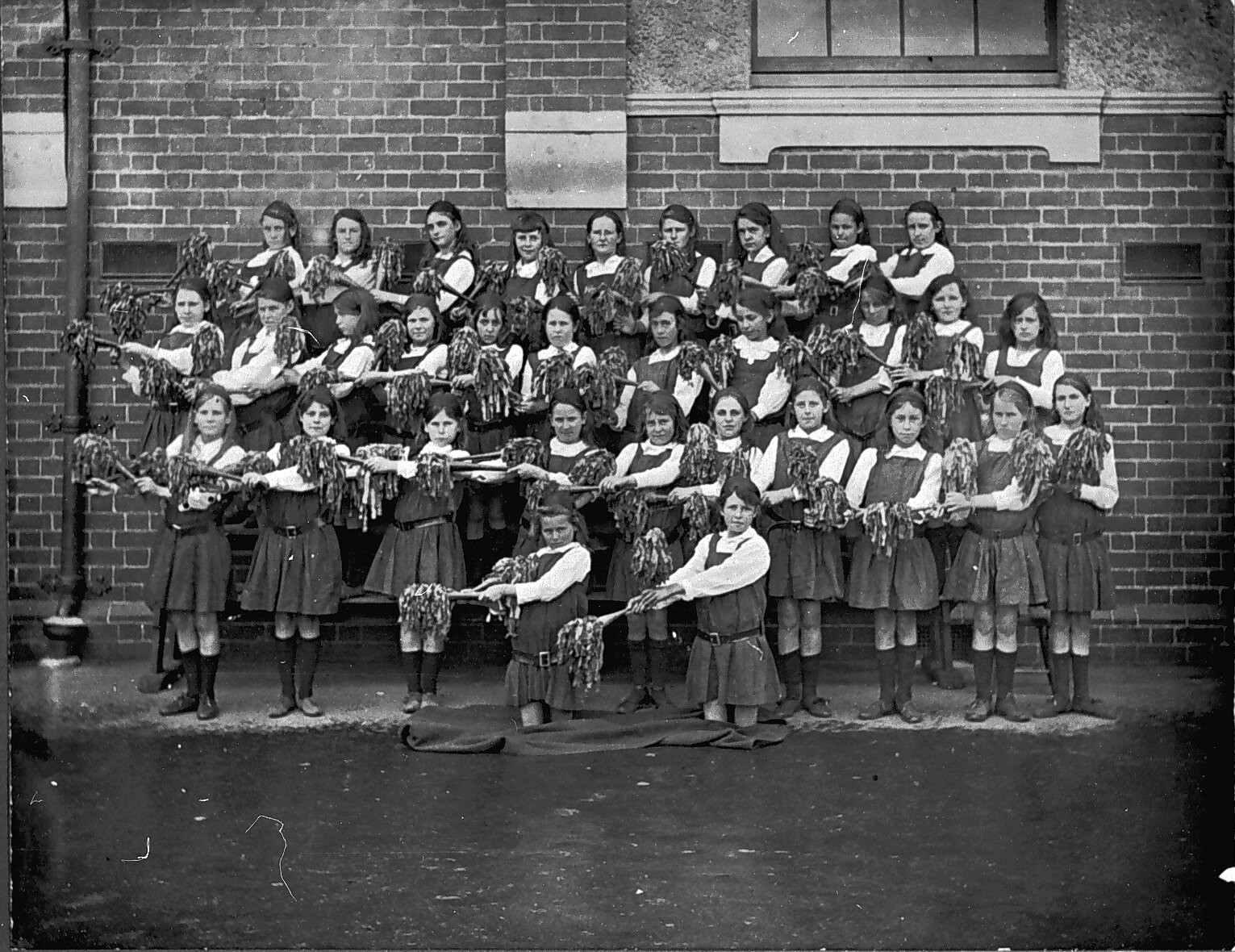 A group of girls exercise with batons at the Fairfield State School. The photograph is formally posed with the girls arranged in rows. They are all in uniform and their batons are decorated with paper tassels.