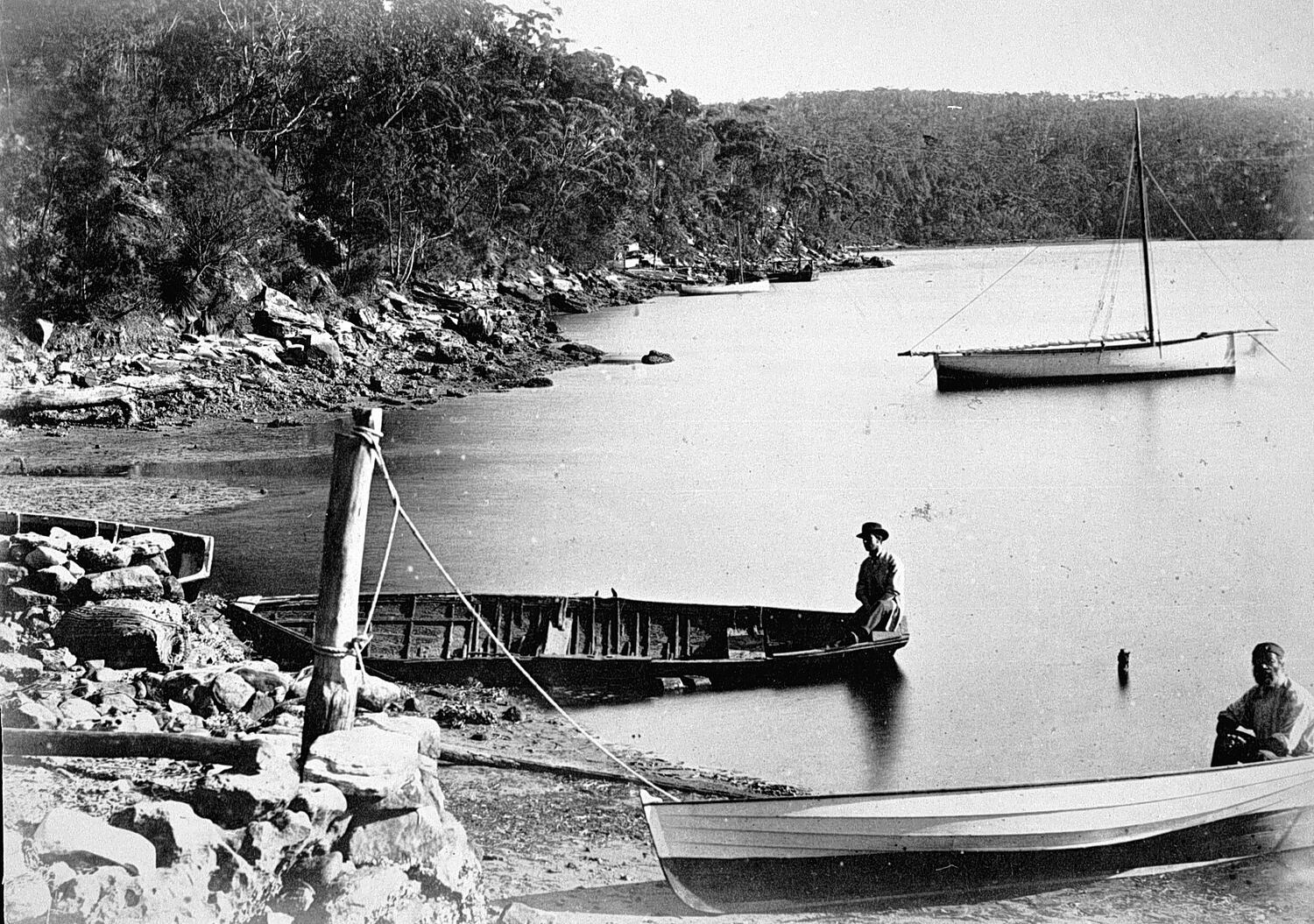 Two men in row boats on the beach at lane cove on Sydney Harbour.