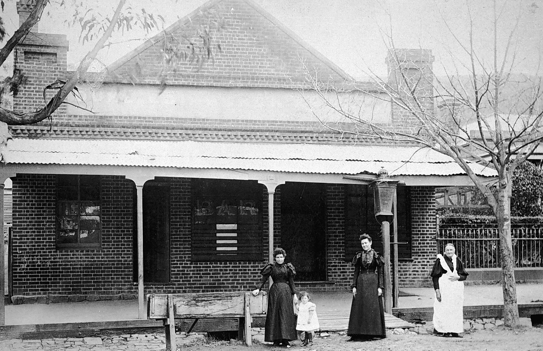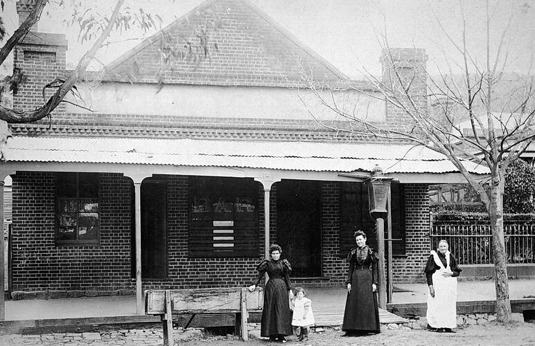 Three women and a child standing outside a single-storey brick building with a verandah. One woman stands with her hand on a hitching post.