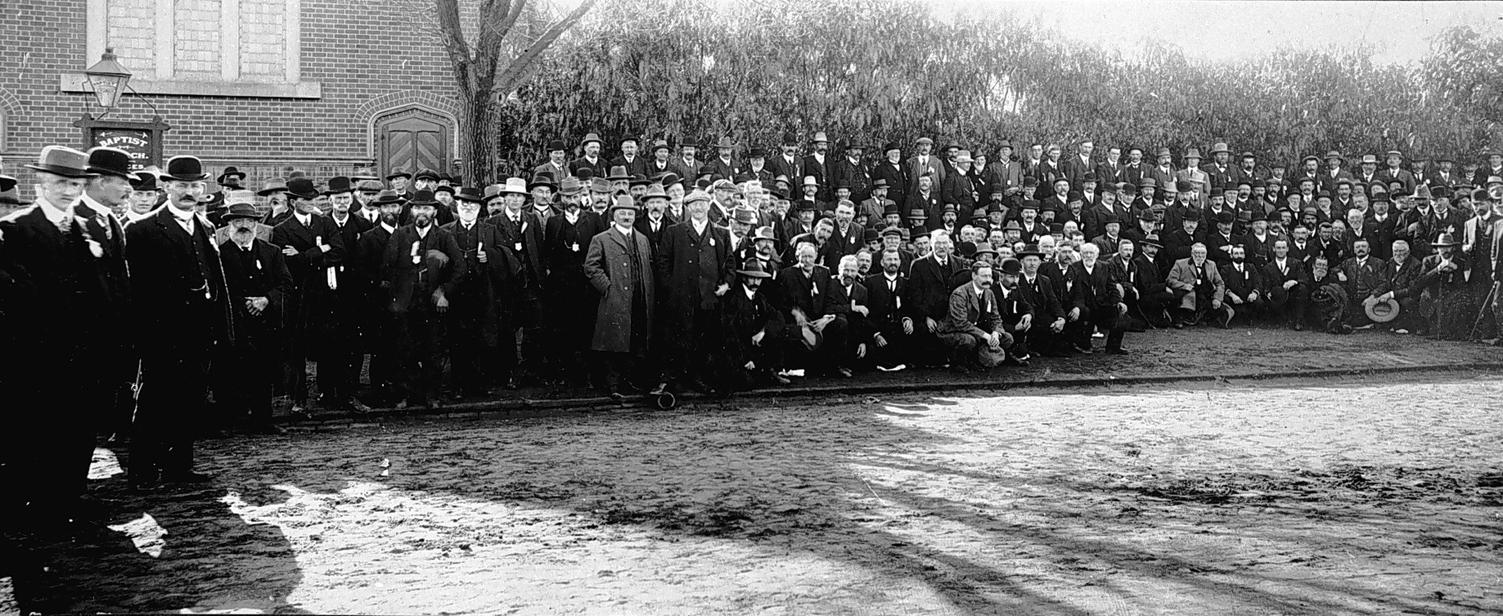 Large group of men in dark suits, overcoats and hats on the lawn outside a Baptist Church (?).