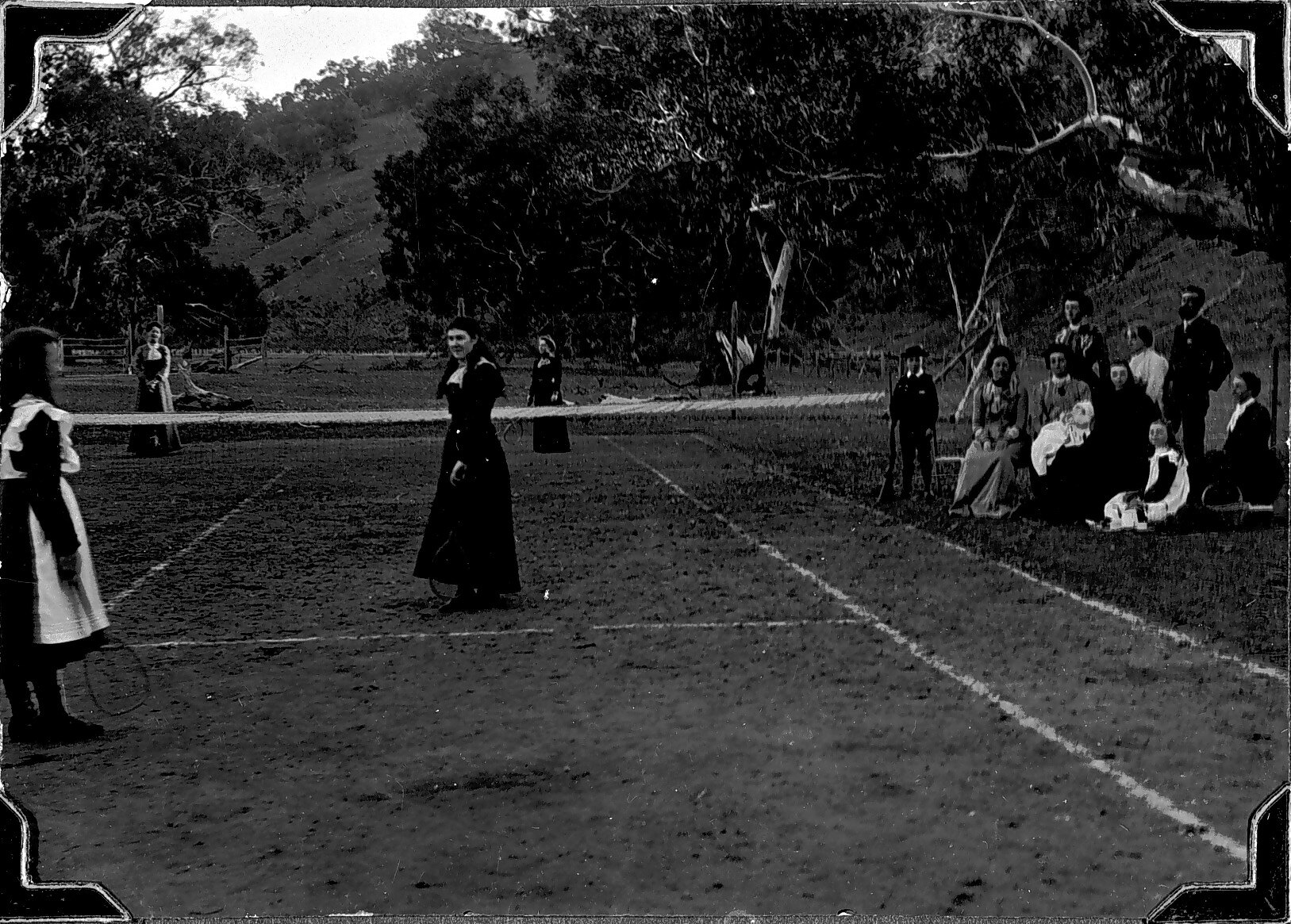 Three women and a girl play doubles on the tennis court at 'Bindi' Station. A family group look on from the sidelines.