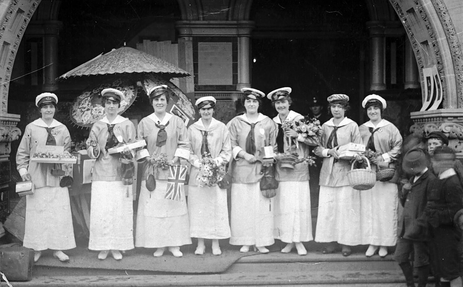 A group of women in naval costume. They carry collecting boxes and trays of flags (?). This is believed to have been for Australia Day.