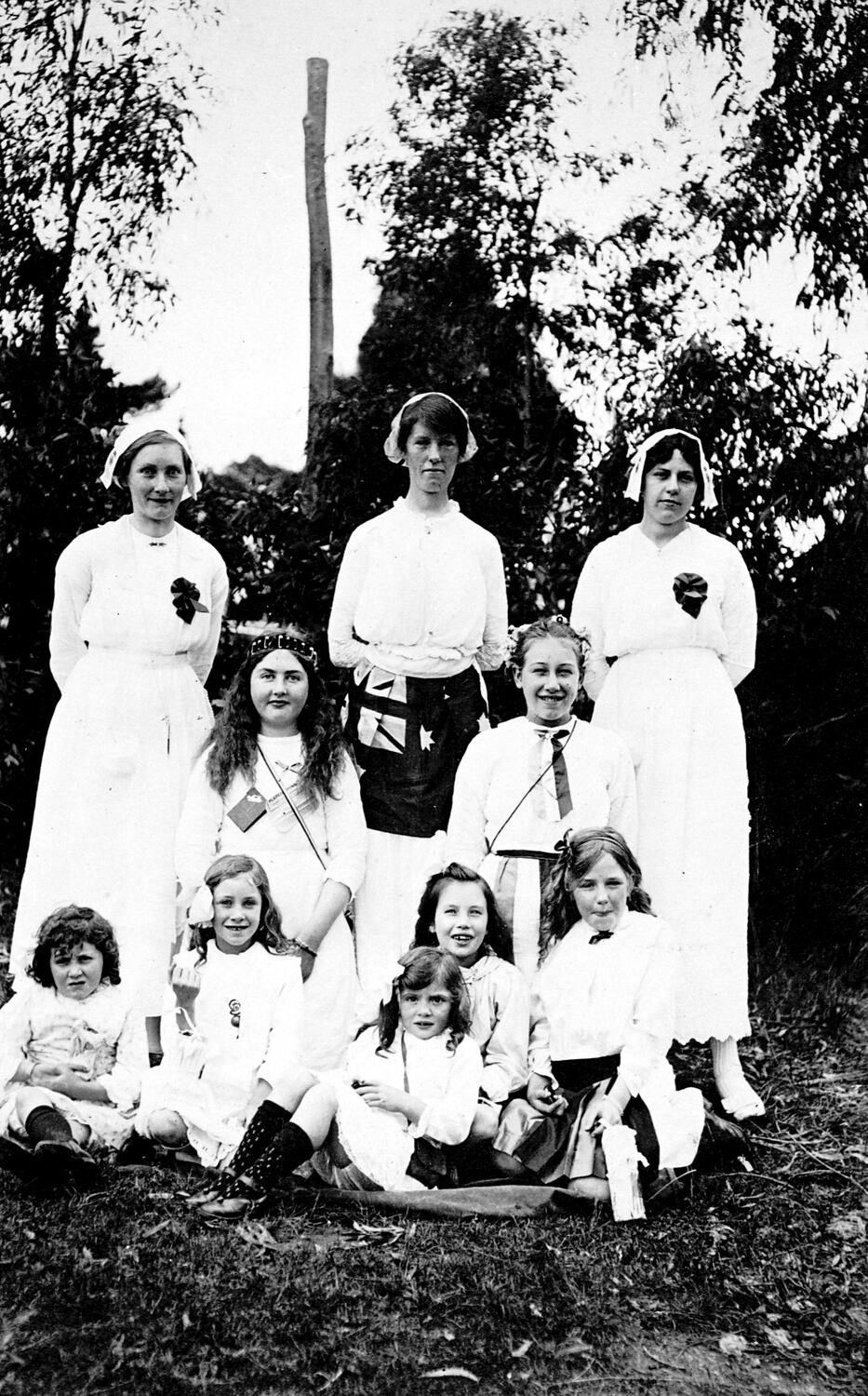 Three women in nurses ' uniforms with a group of small children. One woman is wearing a flag around her waist.