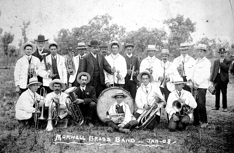 Members of the Morwell Brass Band posed outside with their musical instruments. They are dressed in uniform.