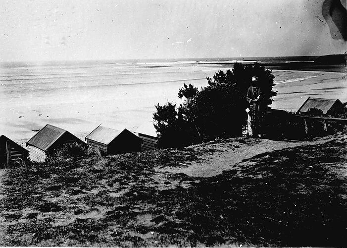 Bathing boxes and the beach at Torquay. A woman stands on the right.