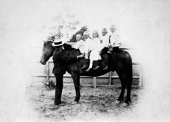 Children of the Selby family on a horse.