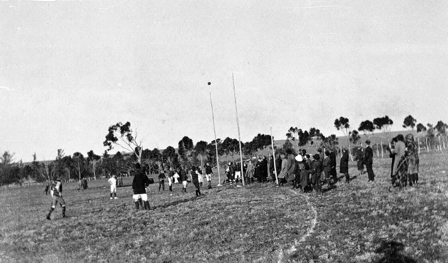 A football match between Batesford and Bannockburn. The ball appears to be going through the goalposts.