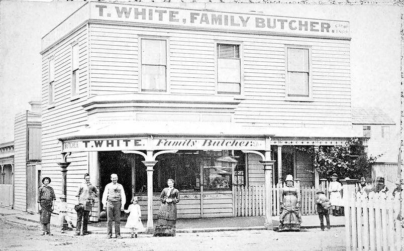 Advertising, Butchers, Commerce, Families, Meat, Picket Fences, Retail Workers, Retailing, Trading, Verandahs