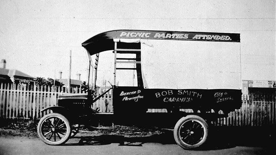 A Ford truck belonging to Bob Smith, carrier, Flemington.