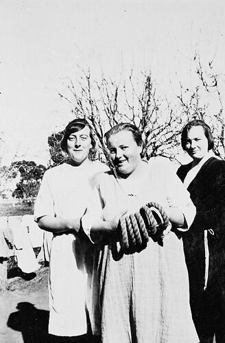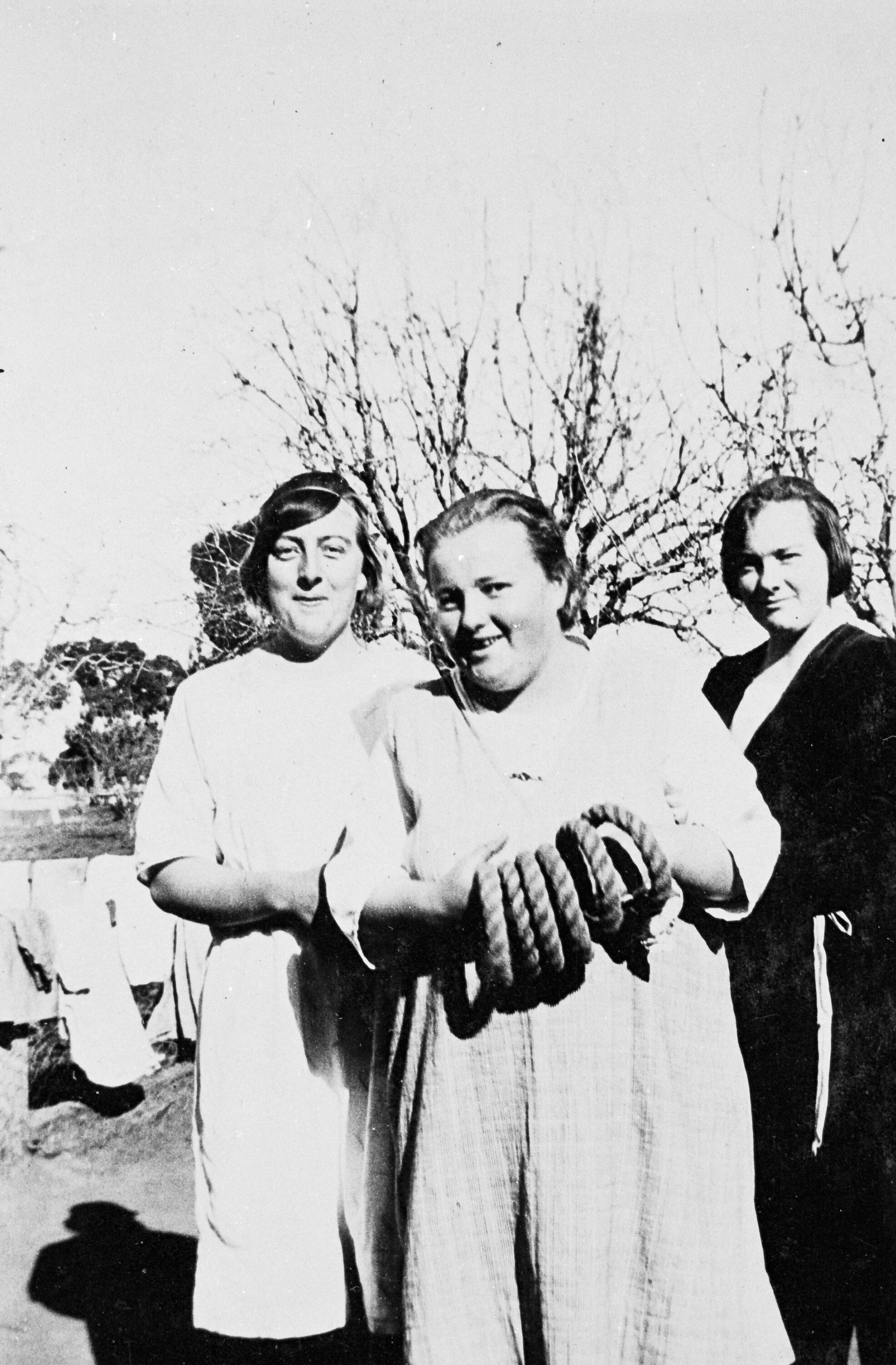 Black and white negative of three women, one who holds quoits, in Wimmera, circa 1925.