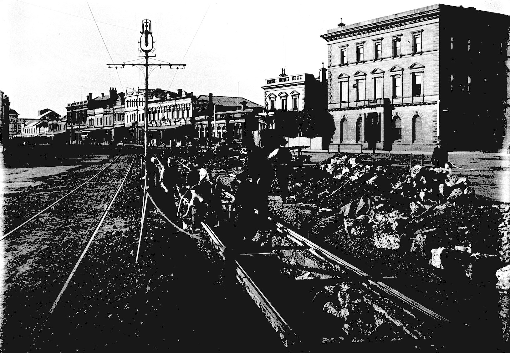 Tramway construction in Malop Street. The Bank of Australasia is in the background.