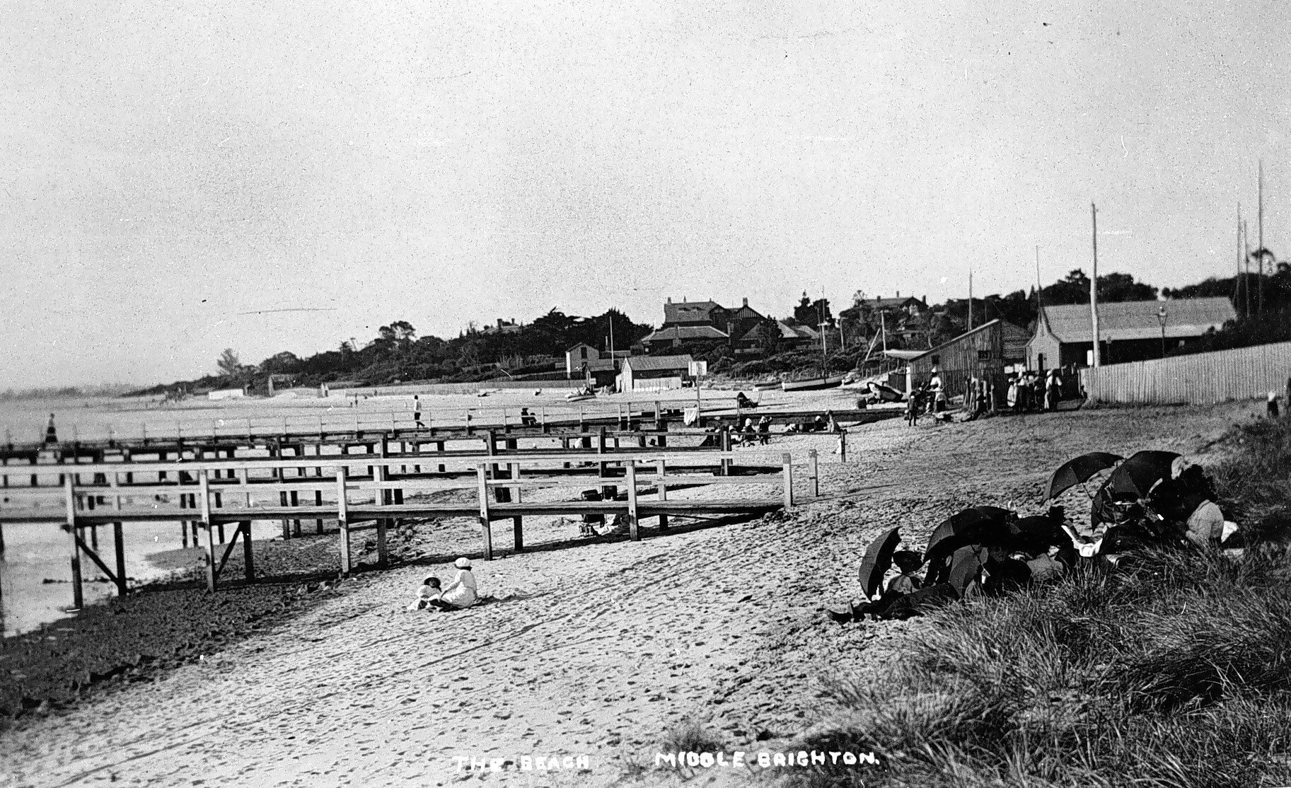 People on the beach at Middle Brighton. The group on the right are all sheltered by umbrellas. There are two piers in the background and an assortment of timber buildings.
