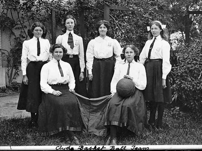The basketball team at Clyde School. The two seated girls hold a banner between them. There appears to be a 'V' on the banner.
