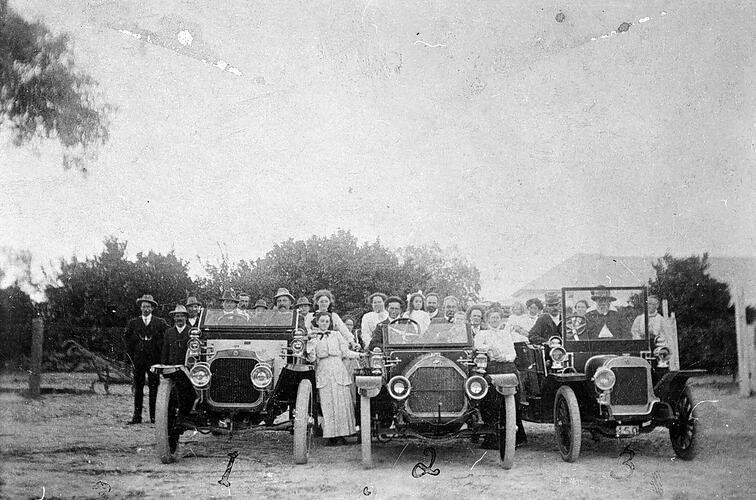 Three cars with a group of people around each. '1','2' and'3' have been written beneath the cars but there is no other information. The car on the right may be that belonging to Thomas Tonkin. (See also MM 007137.).