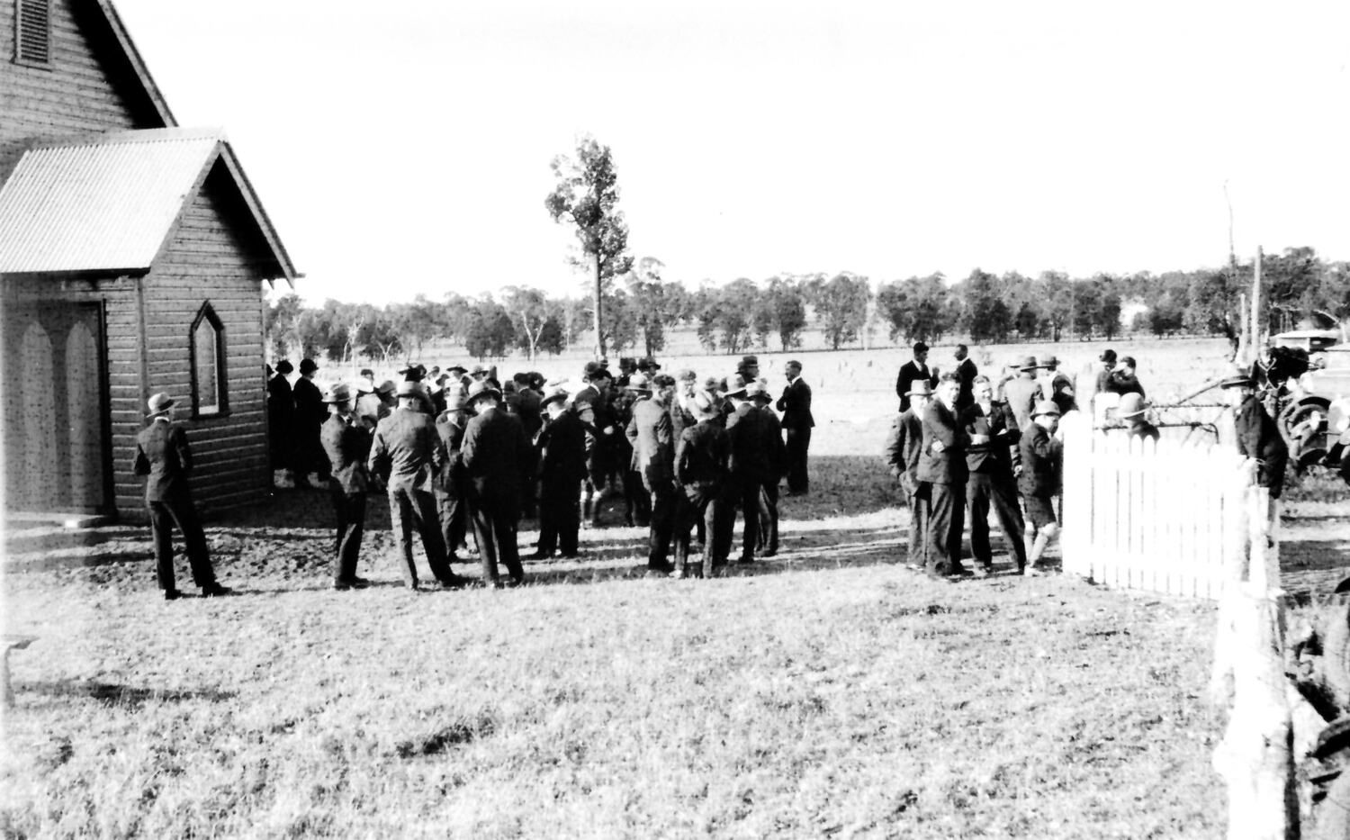 Opening of the Corobimilla Union Church. Services had previously been held in the local hall. The church was built with labour, material and money provided by locals. Land was donated by the Tucket family. People are gathered outside the church.