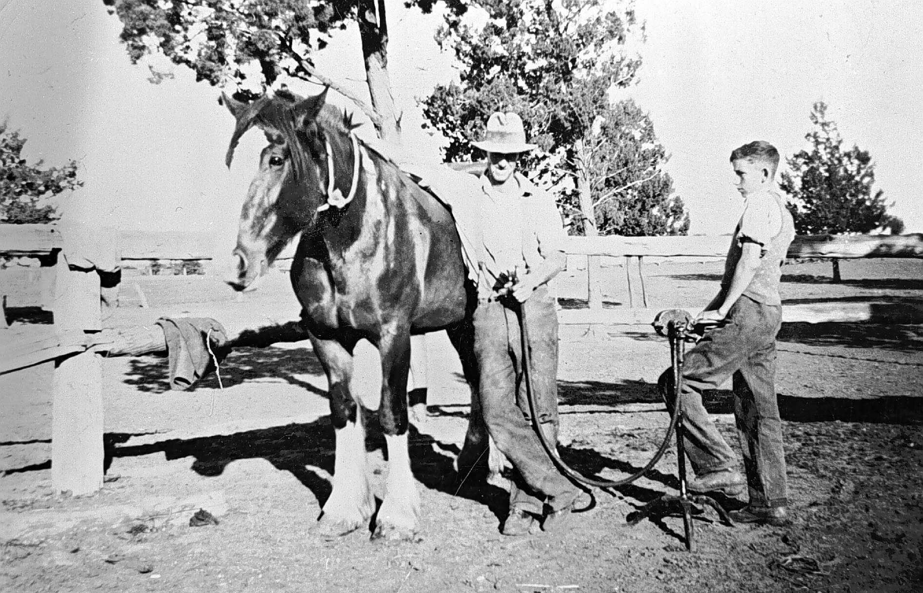 A man and a boy grooming a horse. The man is using clippers powered by a hand-cranked motor held by the boy.