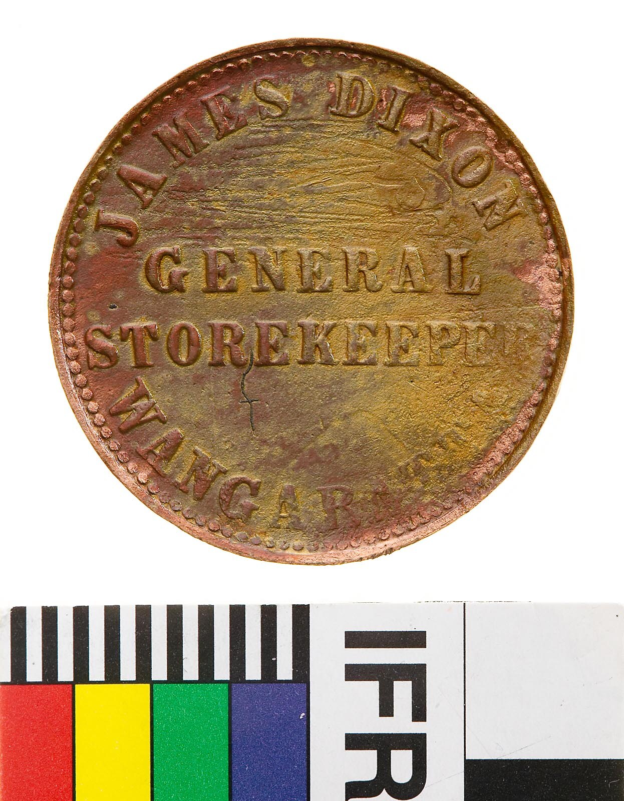 A round copper token (34 mm diameter). The token features the name, town and business of the persons who commissioned the dies from Stokes: James Dixon, Wangaratta, general storekeeper. The reverse is from the R. Grieve of Eagle Hawk die. This is a late strike and the piece has been cleaned and varnished.