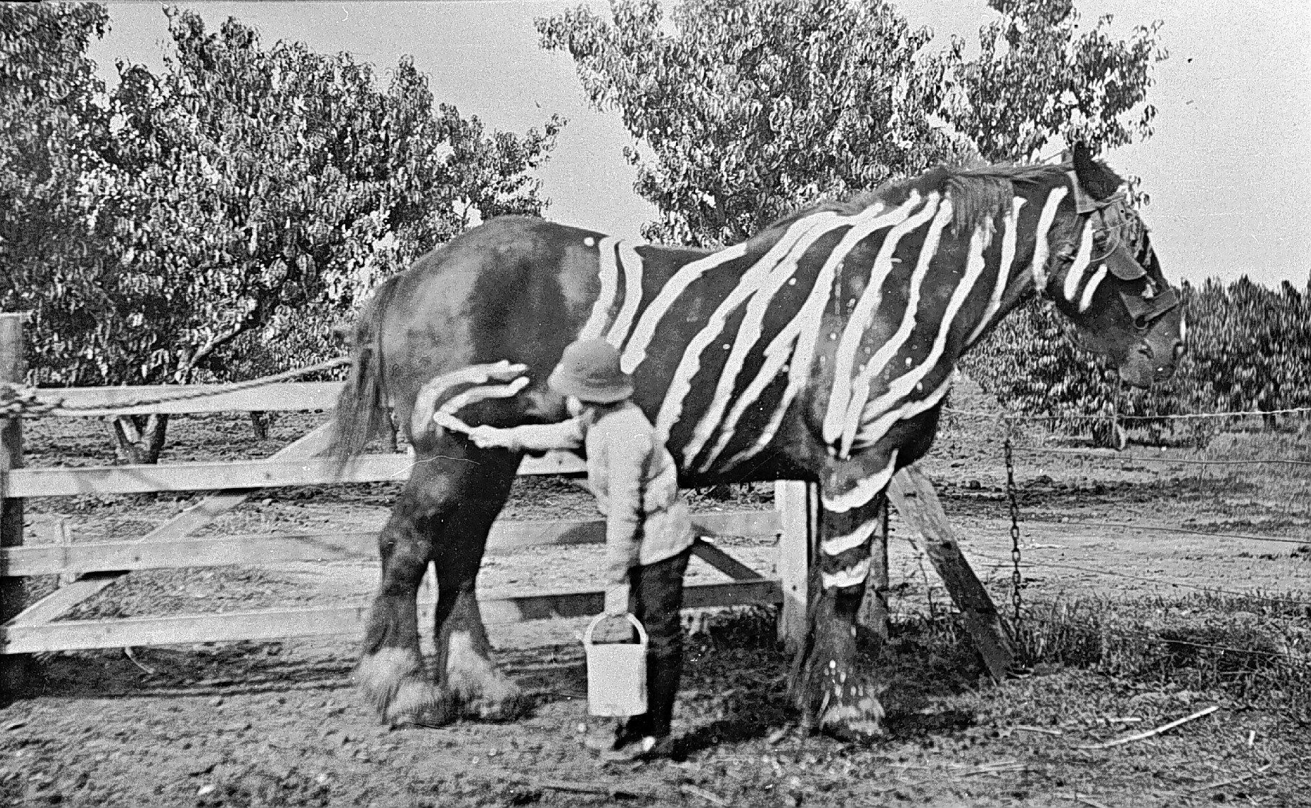 Frank Stephenson painting zebra lines on a horse. There is a wooden gate and a wire fence in the background.