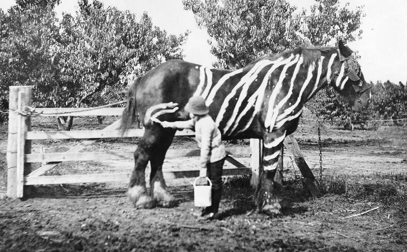 Black and white negative of Frank Stephenson standing beside a horse as he paints zebra stripes on its rear leg, Merrigum, Victoria, 1910. Photographed by Lilian Louisa Pitts.