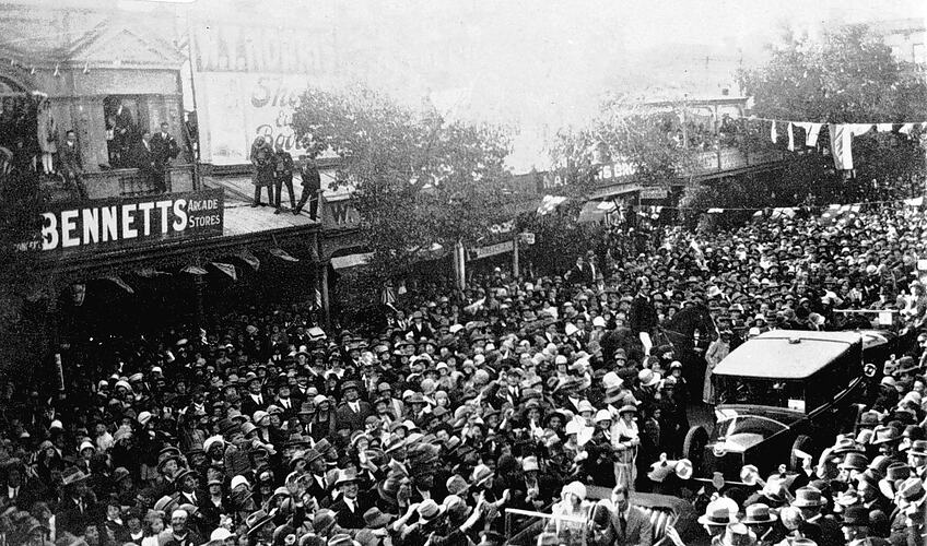 Crowds surrounding the car containing the Duke and Duchess of York. Bennett 's Arcade stores in the background, with people standing on the awning.