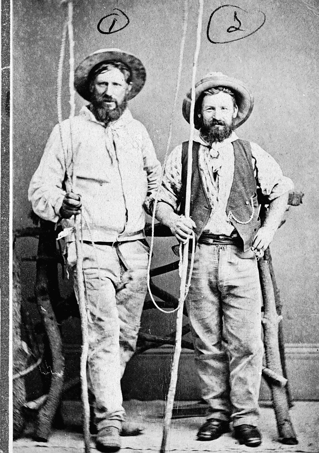 Two bullock drivers in a studio portrait. They are holding their whips. Although the numbers '1' and'2' have been written above them there is no identifying information.